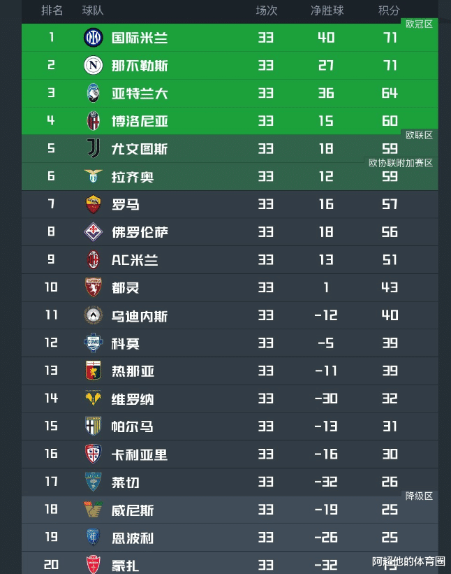 争夺欧冠席位的队伍中,最近2轮连续击败博洛尼亚和AC米兰后,亚特兰大64分牢牢占据第三的位置,暂时稳住主动权。博洛尼亚升到第4位,分数是60分;而本轮输给帕尔马的尤文则跌落至第5位;拉齐奥排在第6,分数和尤文一样都是59分。值得一提的是,罗马57分第7,佛罗伦萨56分第8;从第4名到第8名的5支球队之间最多只有4分的差距;余下5轮比赛,排名都可能发生变化。